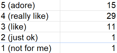 15 five-star ratings and only 2 of 57 that were just ok or worse. I enjoyed just about everything this year.